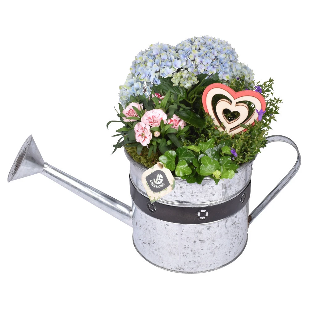 Gießkanne aus Zink mit Blumen bepflanzt und dekoriert
