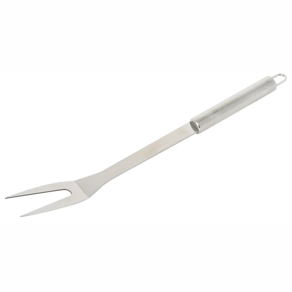 Die robuste Grillgabel aus rostfreiem Edelstahl ist ein passendes Zubehör vor den nächsten Grillabend. Selbst größere Fleischstücke sind kein Problem mehr mit der Gabel. Dank einer Länge von 35 cm bleiben die Hände vor der Hitze geschützt. Bei Nichtgebraucht lässt sich das Grillbesteck platzsparend an der Öse aufhängen.