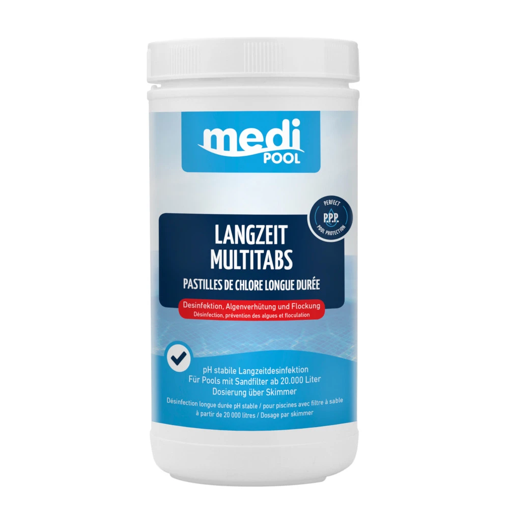 Die Langzeit-Multi-Tabs mit je 200 g sind anhand mehrerer Funktionen ideal als Komplettpflege für den Pool. Die langsam löslichen Chlortabletten mit Dauerdesinfektion, bekämpfen die Algenbildung und wirken als Flockmittel.