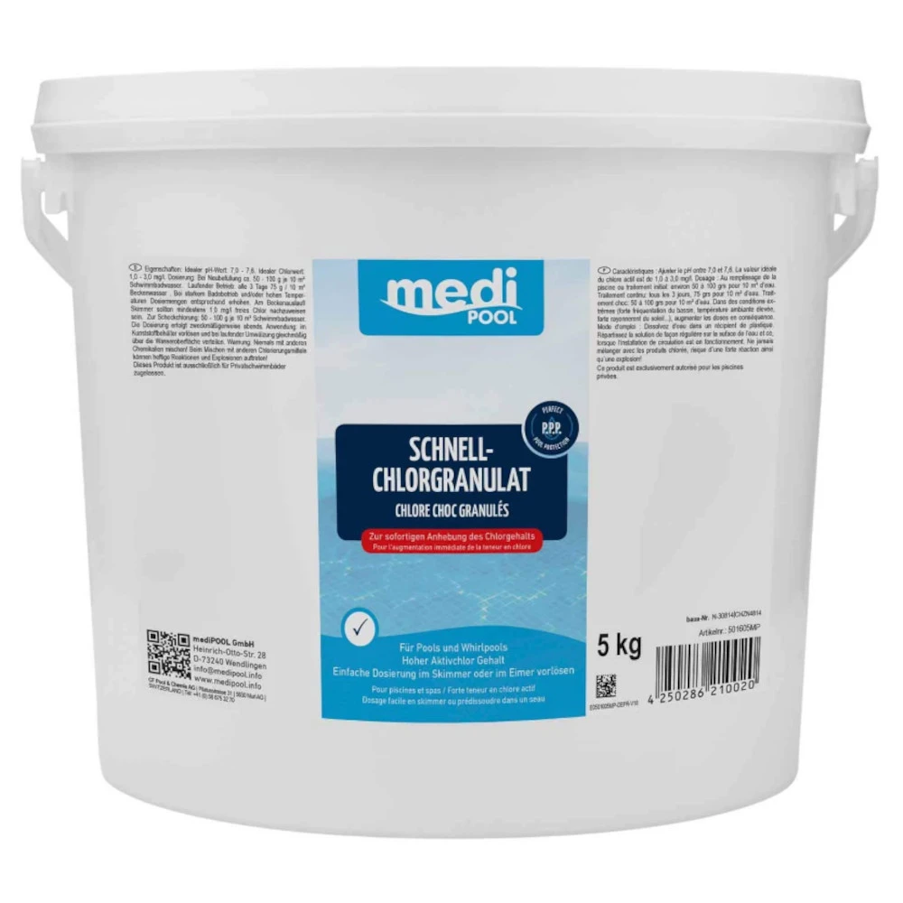Das mediPool Schnell-Chlorgranulat ist ideal zur sofortigen Anhebung des Chlorgehalts dank hohem Aktivchlor-Gehalts. Das Granulat ist für Pools und Whirlpools im privatem Bereich zugelassen. Die Dosierung erfolgt einfach über Skimmer oder nach dem Vorlösen in einem Eimer auch direkt ins Becken anwendbar.
