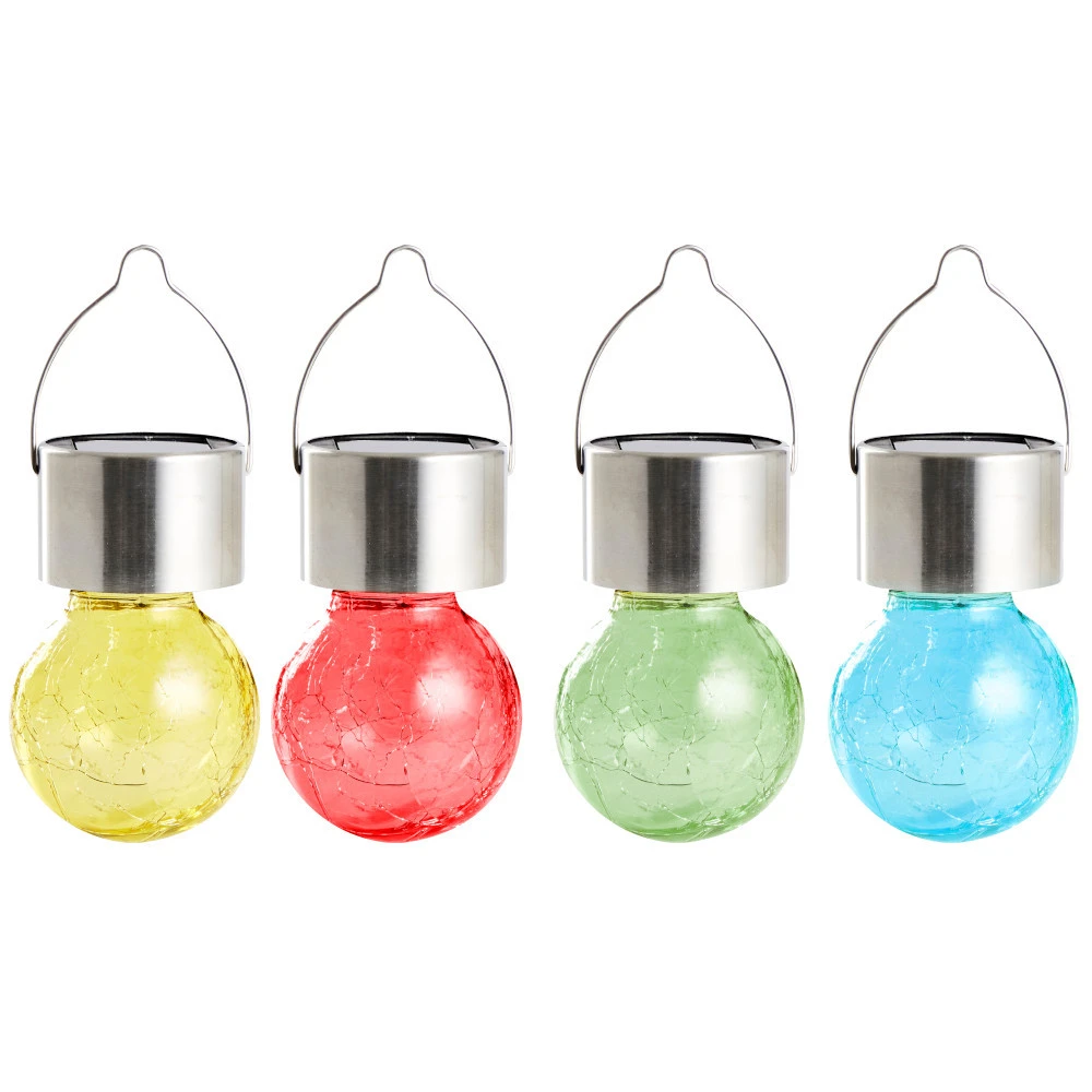 Die solarbetriebene LED-Kugelleuchte aus Crashglas mit warmweißen LED setzt Gartenwege, Blumenbeete oder Pflanzkübel gekonnt in Szene. Verwende die Beleuchtung als dekoratives Orientierungslicht im Außenbereich. Dank des Solarpaneels ist die LED-Leuchtkugel unabhängig von Stromquellen. Somit ist sie eine praktische und umweltfreundliche Gartenbeleuchtung. Dank dem Aufhänghaken kannst du die LED-Beleuchtung überall aufhängen. Die dafür benötigten 2 x 1,2V AA- Batterien sind im Lieferumfang enthalten. Erhältlich ist die Solarlampe in vier verschiedenen Farben, eine freie Farbauswahl ist nicht möglich.