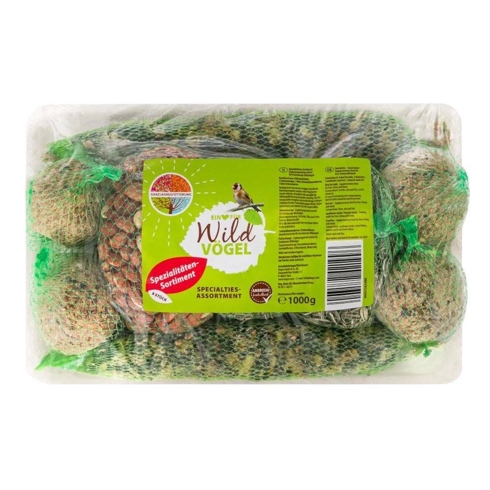 Das große Spezialitäten-Sortiment enthält vier Meisenknödel, zwei Nuss-Stangen, sowie je ein Netz Sonnenblumenkerne und Erdnüsse. Aus besten natürlichen Rohstoffen hergestellt, ist dies ein besonderer Spezialitätenteller für Wildvögel.